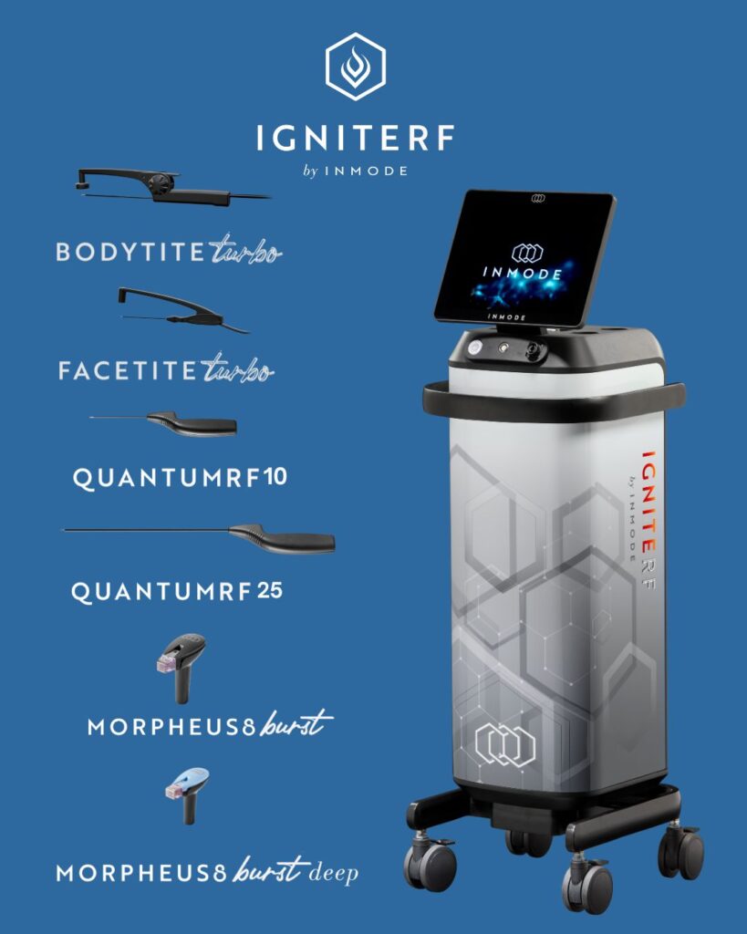 Ignite RF is a safe, minimally invasive treatment that uses advanced fractional RF to tighten skin and remodel fat beneath the surface. Ideal for full-body contouring and rejuvenation. We offer: